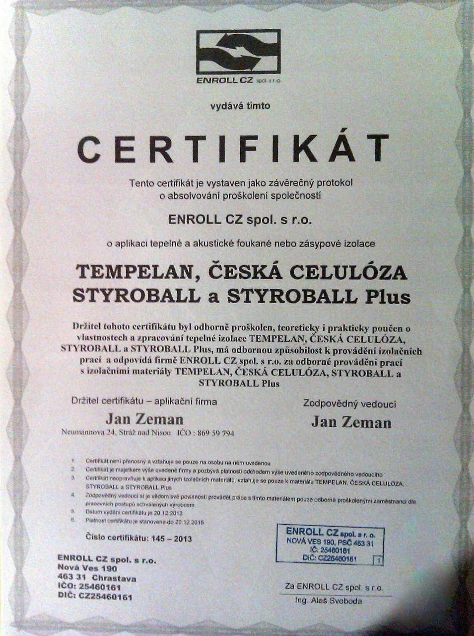 28.12.2013 08:57Na základě prošlých školení a jsme získlali certifikát umožňující našim zákazníkům nabídnout zateplování objektů foukanou celulozou a drceným polystyrenem.